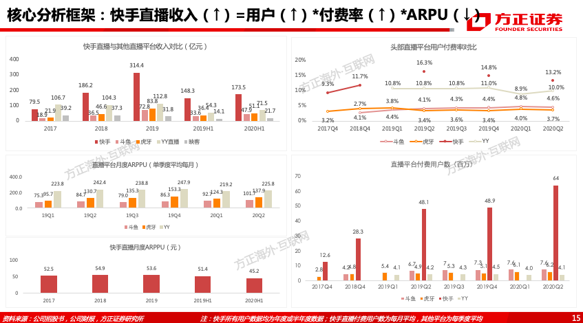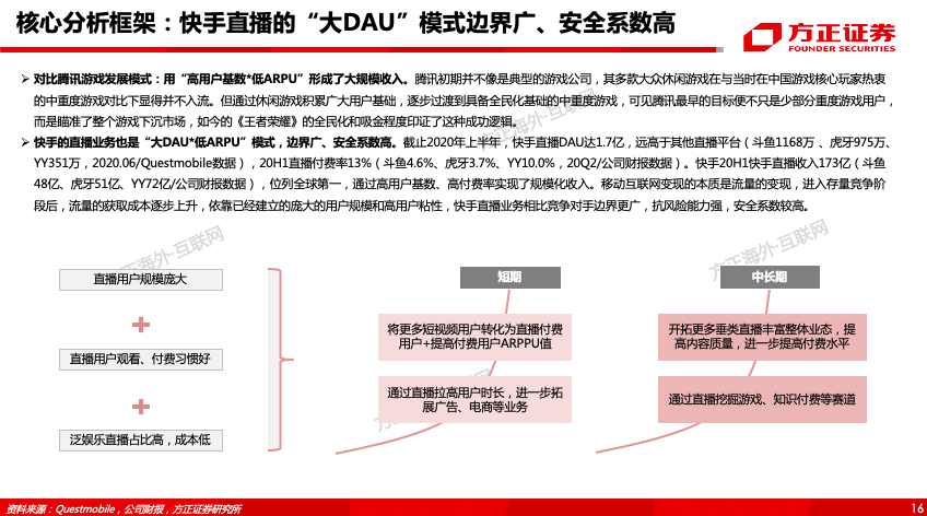 (1)快手直播业务为“大DAU”模式:①用户:截至20H1快手直播DAU达1.7亿(斗鱼1168万、虎牙975万、YY351万,2020.06/Questmobile数据);②付费率:20H1快手直播付费率13%(斗鱼4.6%、虎牙3.7%、YY10.0%,20Q2/公司财报);③收入:20H1快手直播收入173亿(斗鱼48亿、虎牙51亿、YY72亿/公司财报),位列全球第一。