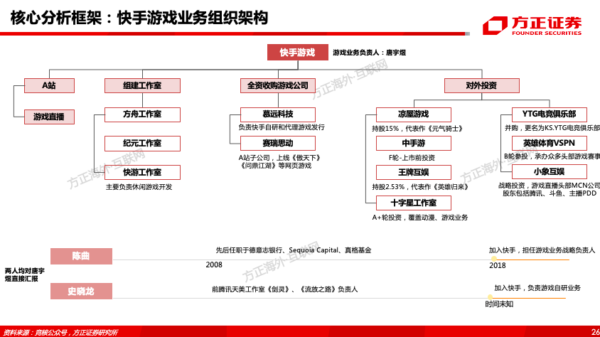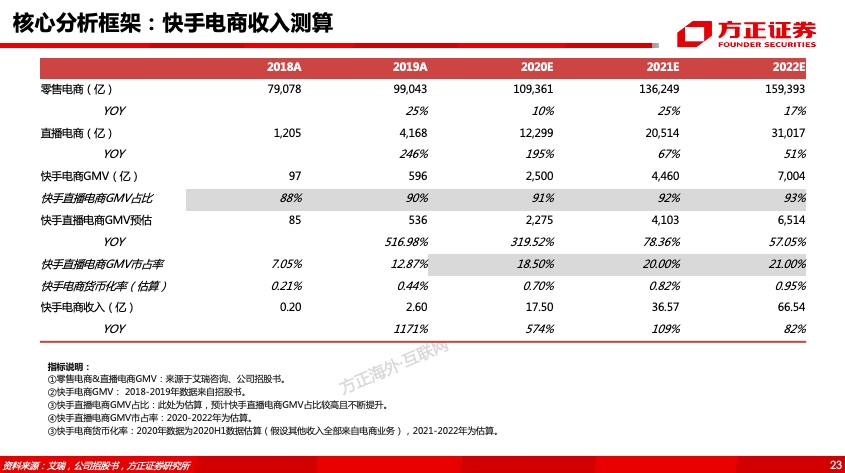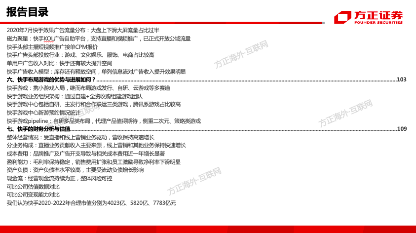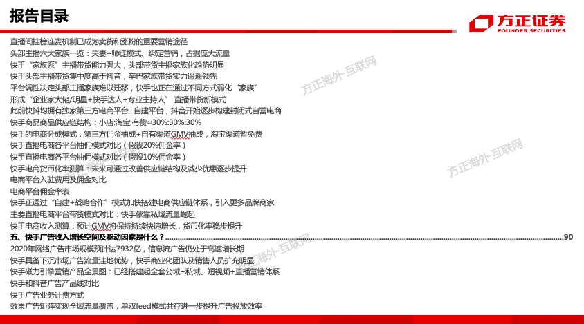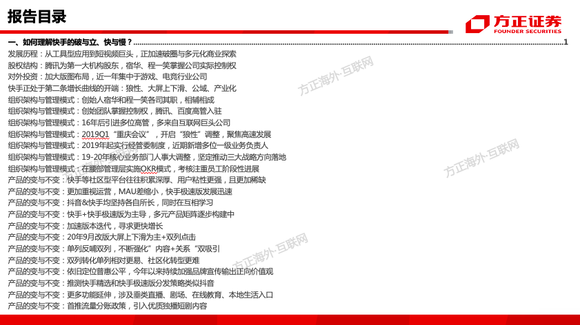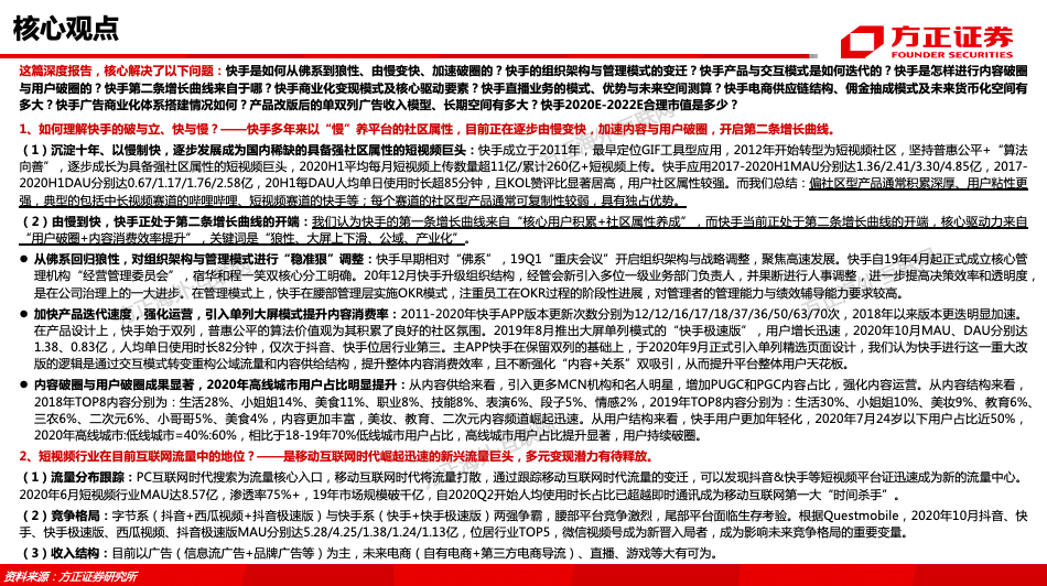 这篇深度报告,核心解决了以下问题:快手是如何从佛系到狼性、由慢变快、加速破圈的?快手的组织架构与管理模式的变迁?快手产品与交互模式是如何迭代的?快手是怎样进行内容破圈与用户破圈的?快手第二条增长曲线来自于哪?快手商业化变现模式及核心驱动要素?快手直播业务的模式、优势与未来空间测算?快手电商供应链结构、佣金抽成模式及未来货币化空间有多大?快手广告商业化体系搭建情况如何?产品改版后的单双列广告收入模型、长期空间有多大?快手2020E-2022E合理市值是多少?
