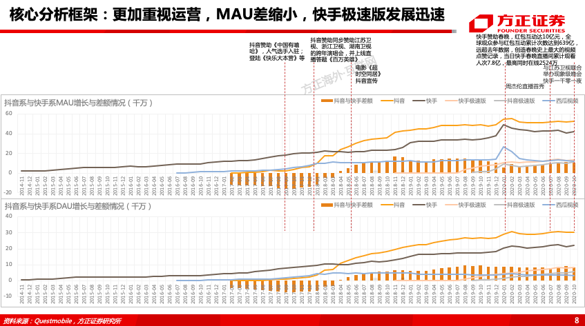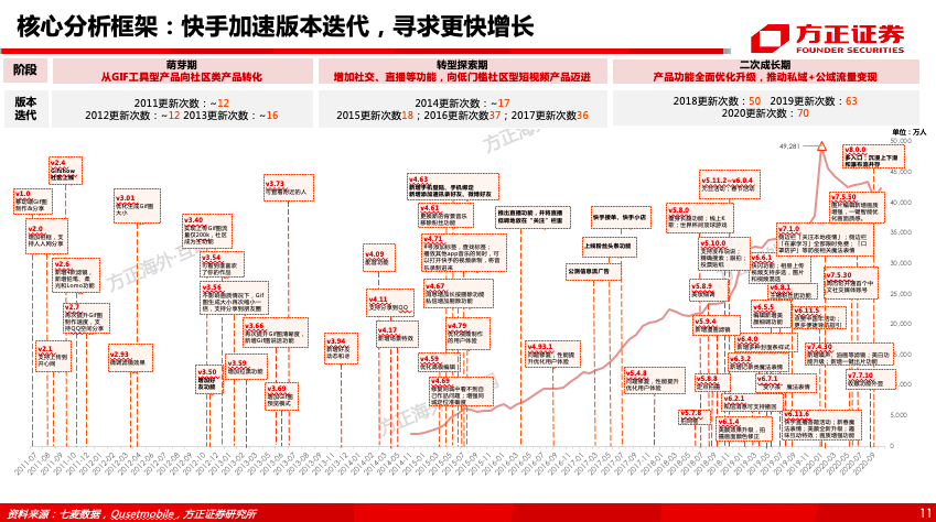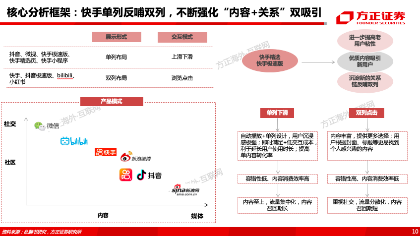 加快产品迭代速度,强化运营,引入单列大屏模式提升内容消费率:2011-2020年快手APP版本更新次数分别为12/12/16/17/18/37/36/50/63/70次,2018年以来版本更迭明显加速。在产品设计上,快手始于双列,普惠公平的算法价值观为其积累了良好的社区氛围。2019年8月推出大屏单列模式的“快手极速版”,用户增长迅速,2020年10月MAU、DAU分别达1.38、0.83亿,人均单日使用时长82分钟,仅次于抖音、快手位居行业第三。主APP快手在保留双列的基础上,于2020年9月正式引入单列精选页面设计,我们认为快手进行这一重大改版的逻辑是通过交互模式转变重构公域流量和内容供给结构,提升整体内容消费效率,且不断强化“内容+关系”双吸引,从而提升平台整体用户天花板。