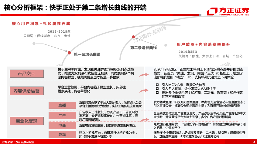 (2)由慢到快,快手正处于第二条增长曲线的开端:我们认为快手的第一条增长曲线来自“核心用户积累+社区属性养成”,而快手当前正处于第二条增长曲线的开端,核心驱动力来自“用户破圈+内容消费效率提升”,关键词是“狼性、大屏上下滑、公域、产业化”。