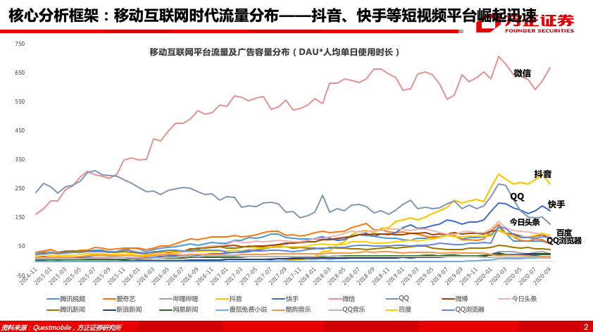 (2)竞争格局:字节系(抖音+西瓜视频+抖音极速版)与快手系(快手+快手极速版)两强争霸,腰部平台竞争激烈,尾部平台面临生存考验。根据Questmobile,2020年10月抖音、快手、快手极速版、西瓜视频、抖音极速版MAU分别达5.28/4.25/1.38/1.24/1.13亿,位居行业TOP5,微信视频号成为新晋入局者,成为影响未来竞争格局的重要变量。