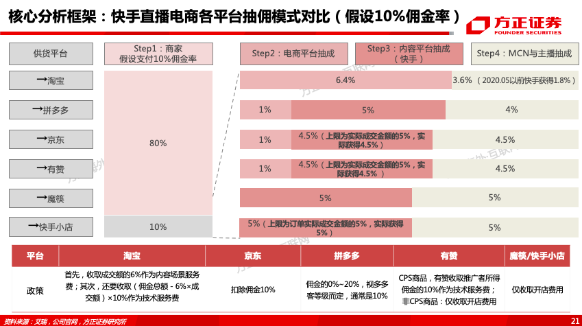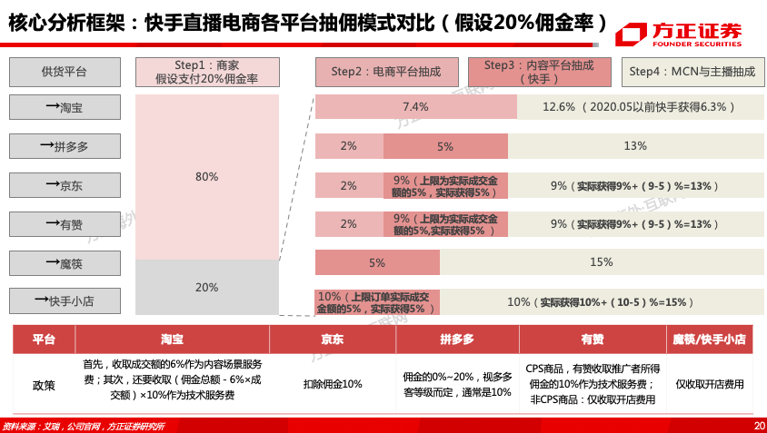 (2)快手直播供应链结构和分成模式:从供应链结构上来说,截止20年Q1快手商品中来自快手小店、有赞、淘宝、魔筷星选的比例分别为30%、30%、30%、10%。分成模式采用第三方佣金抽成+自有渠道GMV抽成,多为佣金的50%或实际GMV的5%,20年5月最新政策淘宝渠道暂免费。