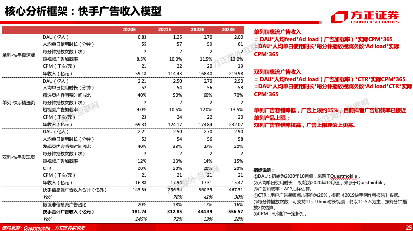 5、快手广告收入增长空间及驱动因素是什么?——单双列互补、私域公域相结合、广告变现效率提升显著,我们预计2020-2023年快手广告收入有望分别达182/313/434/557亿。