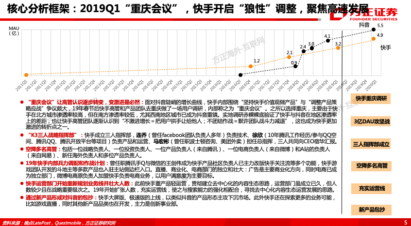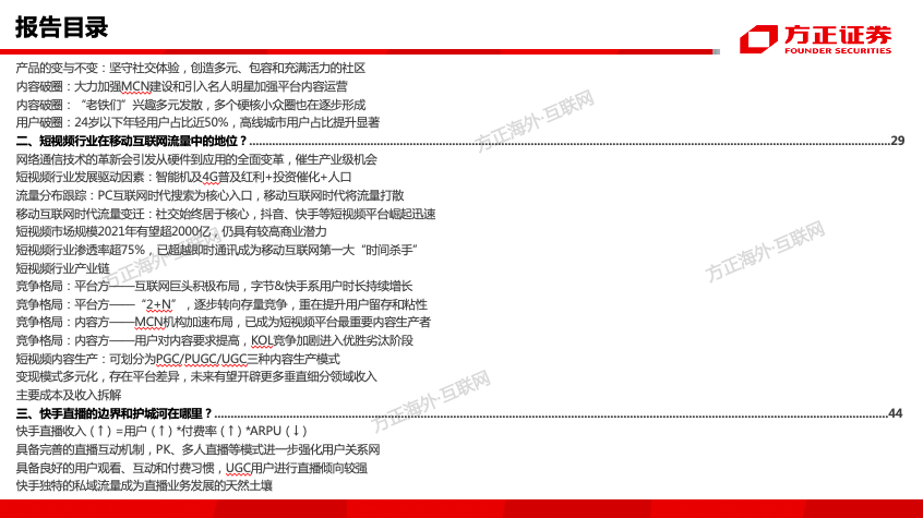 1、如何理解快手的破与立、快与慢?——快手多年来以“慢”养平台的社区属性,目前正在逐步由慢变快,加速内容与用户破圈,开启第二条增长曲线。