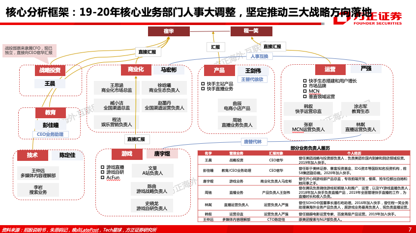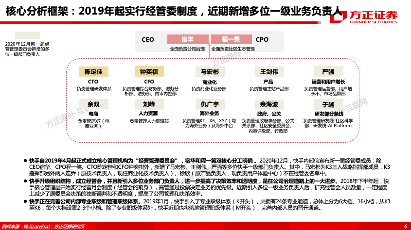 从佛系回归狼性,对组织架构与管理模式进行“稳准狠”调整:快手早期相对“佛系”,19Q1“重庆会议”开启组织架构与战略调整,聚焦高速发展。快手自19年4月起正式成立核心管理机构“经营管理委员会”,宿华和程一笑双核心分工明确。20年12月快手升级组织结构,经管会新引入多位一级业务部门负责人,并果断进行人事调整,进一步提高决策效率和透明度,是在公司治理上的一大进步。在管理模式上,快手在腰部管理层实施OKR模式,注重员工在OKR过程的阶段性进展,对管理者的管理能力与绩效辅导能力要求较高。