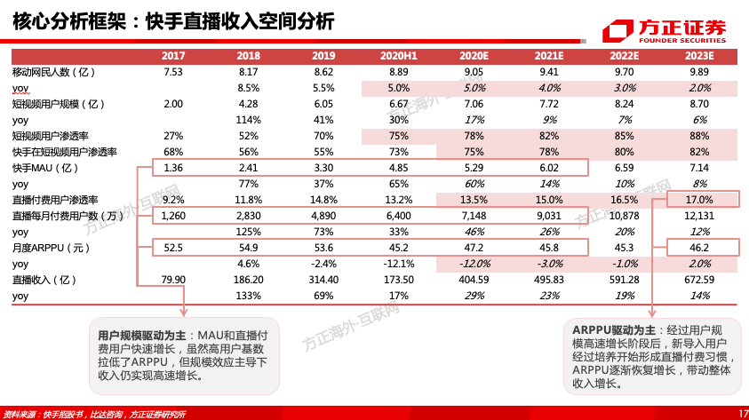 (3)快手直播业务未来空间:从短期看,驱动因素为直播用户渗透率+付费率提升,并通过直播拉高用户时长,进一步拓展广告、电商等业务;从中长期看,开拓更多垂类直播丰富整体业态,提高内容质量,提升ARPPU,并挖掘游戏、知识付费等赛道。据我们测算,快手直播业务增长将逐步由用户规模驱动转变为ARPPU驱动,2020-2023年收入有望分别达405/496/591/673亿。