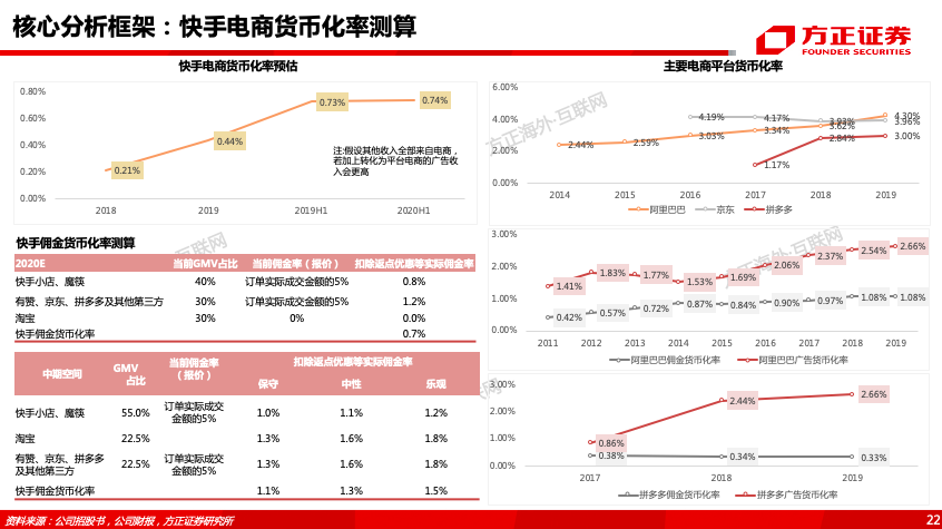 4、快手电商GMV的空间及变现弹性有多大?——供应链结构优化+优惠力度降低将带动服务费/佣金抽成提升,中期有望达1.1%~1.5%,预计2023年收入将超百亿。
