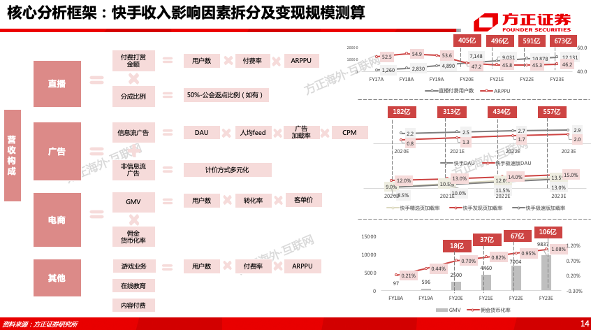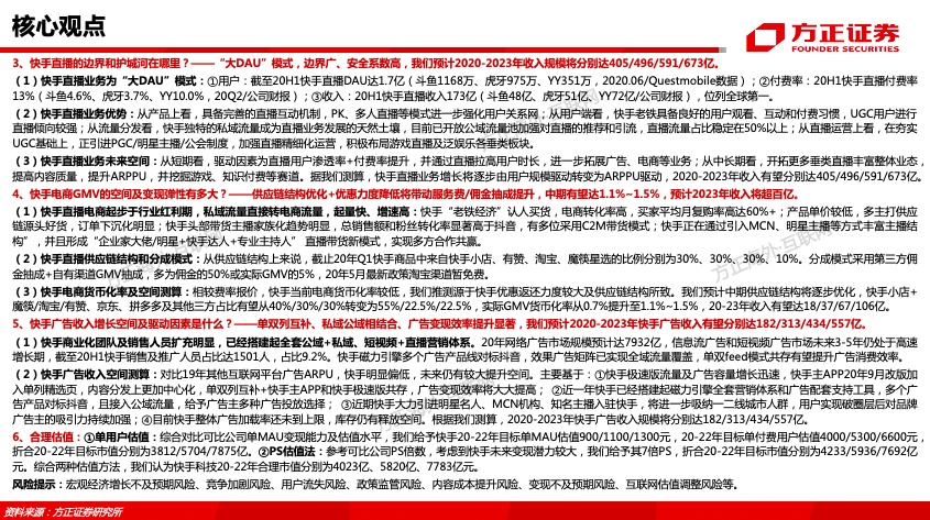 3、快手直播的边界和护城河在哪里?——“大DAU”模式,边界广、安全系数高,我们预计2020-2023年收入规模将分别达405/496/591/673亿。