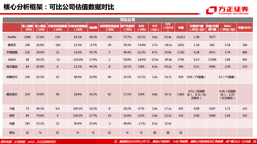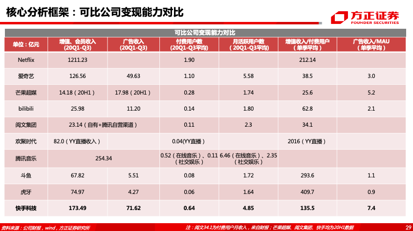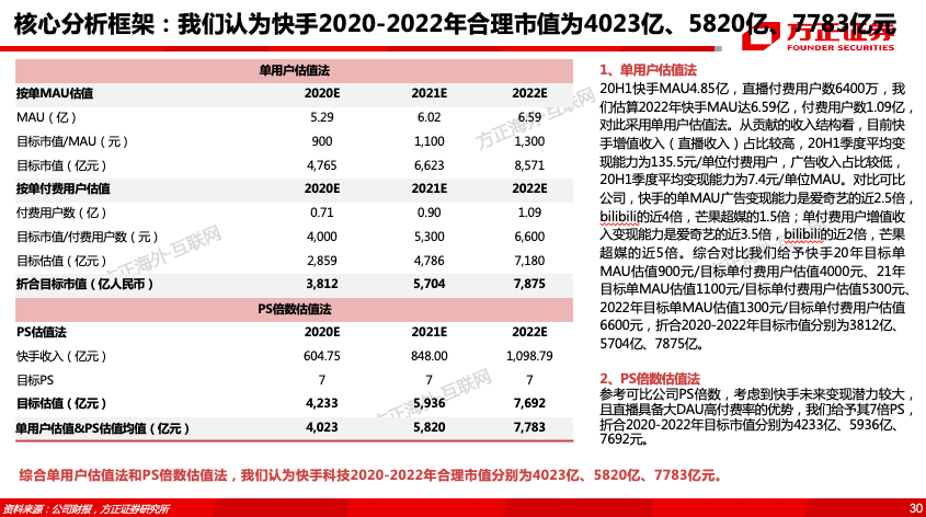 6、合理估值:①单用户估值:综合对比可比公司单MAU变现能力及估值水平,我们给予快手20-22年目标单MAU估值900/1100/1300元,20-22年目标单付费用户估值4000/5300/6600元,折合20-22年目标市值分别为3812/5704/7875亿。②PS估值法:参考可比公司PS倍数,考虑到快手未来变现潜力较大,我们给予其7倍PS,折合20-22年目标市值分别为4233/5936/7692亿元。综合两种估值方法,我们认为快手科技20-22年合理市值分别为4023亿、5820亿、7783亿元。