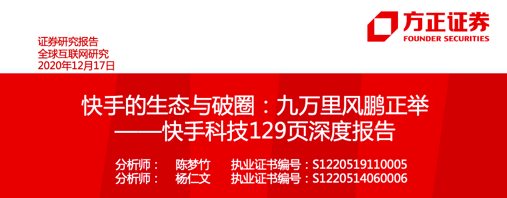 本文来自方正证券研究所于2020年12月17日发布的报告《快手的生态与破圈:九万里风鹏正举——快手科技129页深度报告》 杨仁文 S1220514060006