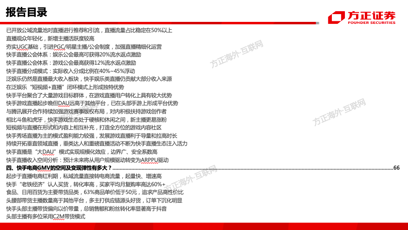 (2)快手直播业务优势:从产品上看,具备完善的直播互动机制,PK、多人直播等模式进一步强化用户关系网;从用户端看,快手老铁具备良好的用户观看、互动和付费习惯,UGC用户进行直播倾向较强;从流量分发看,快手独特的私域流量成为直播业务发展的天然土壤,目前已开放公域流量池加强对直播的推荐和引流,直播流量占比稳定在50%以上;从直播运营上看,在夯实UGC基础上,正引进PGC/明星主播/公会制度,加强直播精细化运营,积极布局游戏直播及泛娱乐各垂类板块。