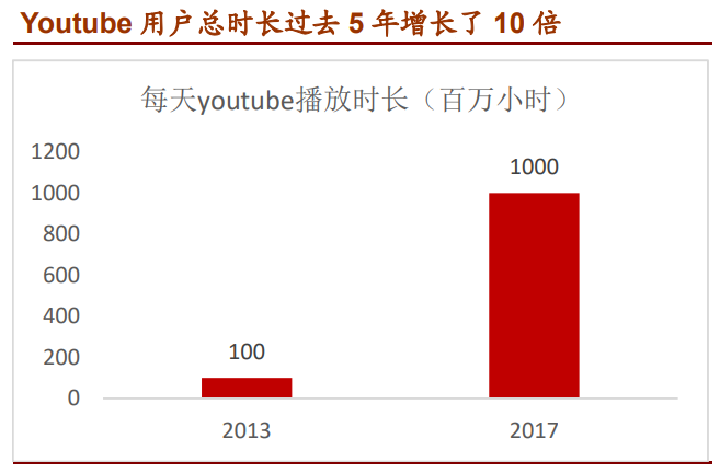 Youtube 过去 5 年用户使用时长增长了 10 倍,业务进入成熟期。而Youtube 的内容制作及获取成本却远低于其他视频公司,主要由于 Youtube 内容多来自用户自制。