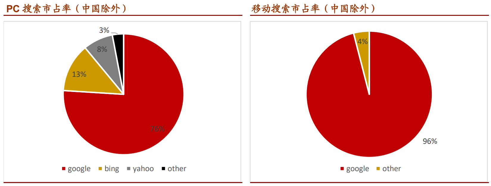 Google 桌面搜索业务多年以来市占率一直在 75%以上。在移动搜索领域,谷歌的搜索份额接近 95%,几乎不存在其他竞争对手。