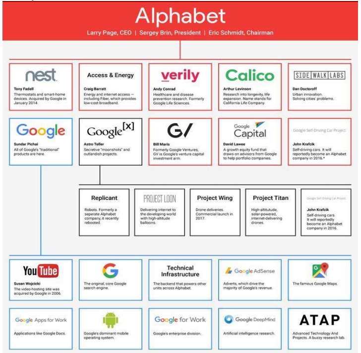 谷歌于美国时间 2015 年 8 月 10 日宣布,它将对企业架构进行调整,通过创办一家名为 Alphabet 的“伞形公司”(Umbrella Company)。主要的互联网服务服务业务归属于划归 google 旗下,其他业务在 Alphabet 旗下成立独立子公司。