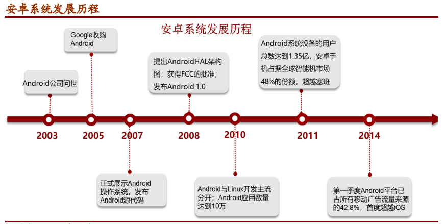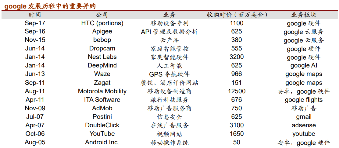 Google 发展历程中一些列重要的并购,为其后续的战略布局,业务发展奠定了重要基础:2005 年收购安卓、2006 年收购 youtube、2009 年收购 admob、2014 年收购 nest、2017年收购 HTC 等。