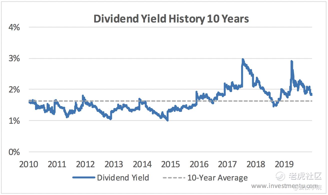 星巴克目前的股息收益率为1.83%,高于10年平均值1.63%。下图显示了过去10年的股息收益率:
