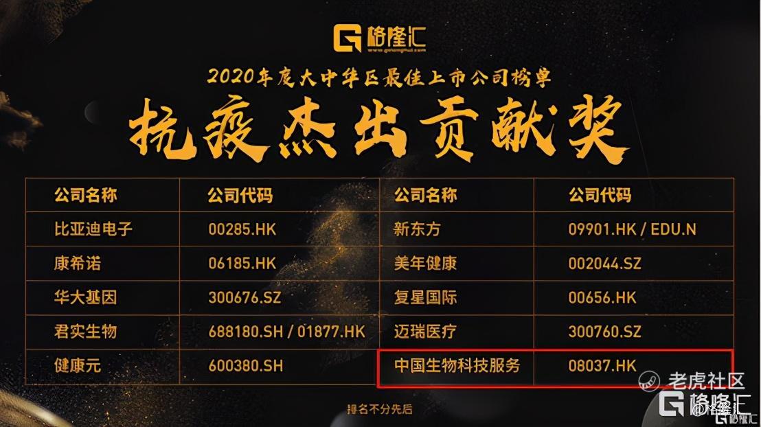 2020年11月16日,由格隆汇主办的“格隆汇·全球投资嘉年华·2020”在四川成都世纪城国际会议中心隆重举行。在“大中华区最佳上市公司颁奖晚会”上发布了2020年上市公司相关奖项,中国生物科技服务(8037.HK)荣获2020年度抗疫杰出贡献奖。