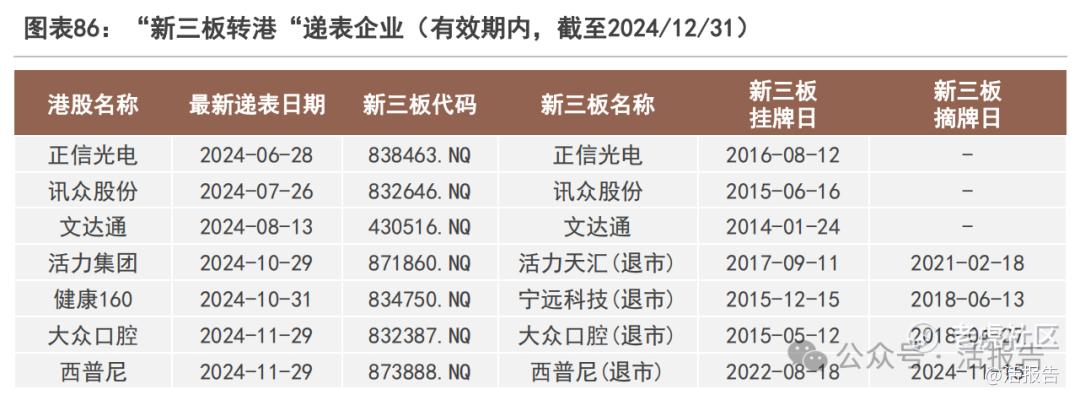 截至2024年12月31日,在有效期内的递表企业中,有7家新三板企业向港交所递交上市申请,其中活力集团、健康160、大众口腔、西普尼已在新三板摘牌,正信光电、讯众股份、文达通还未摘牌;