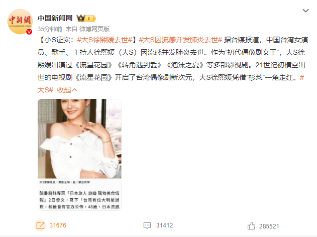 传闻得到证实。据中国新闻网援引台媒消息,小S(徐熙娣)证实,大S(徐熙媛)去世。