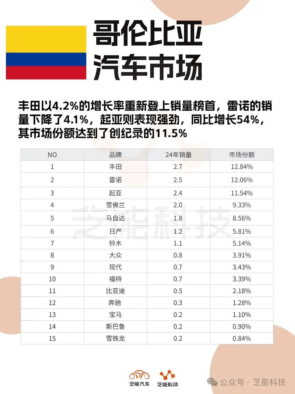 2024 年哥伦比亚汽车市场的复苏为各品牌带来了新的机遇。传统品牌继续巩固优势,而中国品牌的快速崛起则为市场注入了新的活力,20多万的市场我们也跟踪下。