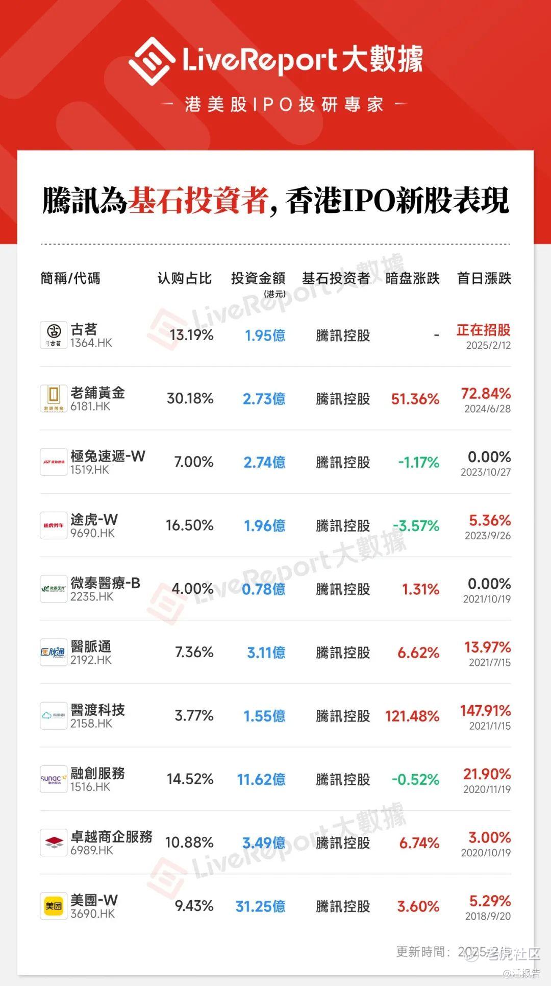 而即将上市的古茗募资规模最小,孖展认购倍数达172倍,基石投资占比37.46%。对比茶百道,古茗有基石,虽然没达到50%以上,但有腾讯、美团龙珠、正心谷等知名投资人站台,这也给足了打新投资者一定的信心。此外,据LiveReport大数据,腾讯作为基石参与的公司,其大多数公司的暗盘及首日的表现都不错。