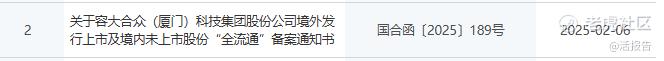 中国证监会发布公告,容大合众最近一周通过证监会境外上市及股份“全流通”备案,拿到备案通知书。
