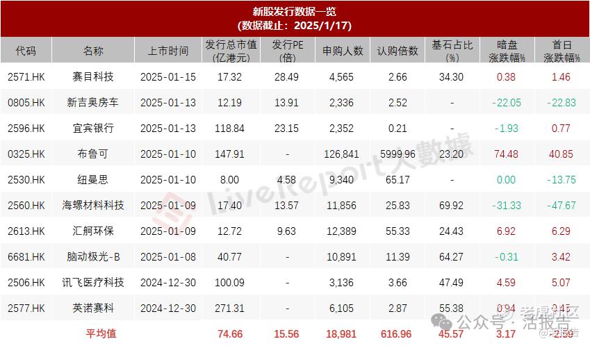 近10只新股暗盘平均上涨3.17%,首日平均下跌2.59%;港股打新正式进入2025年,从近期上市新股表现来看,12月份的打新红利渐渐消退,个别新股表现走差,如海螺材料科技、纽曼思及新吉奥房车;此外布鲁可或是这个打新阶段的小终点,接下来就要重新开始新的周期。