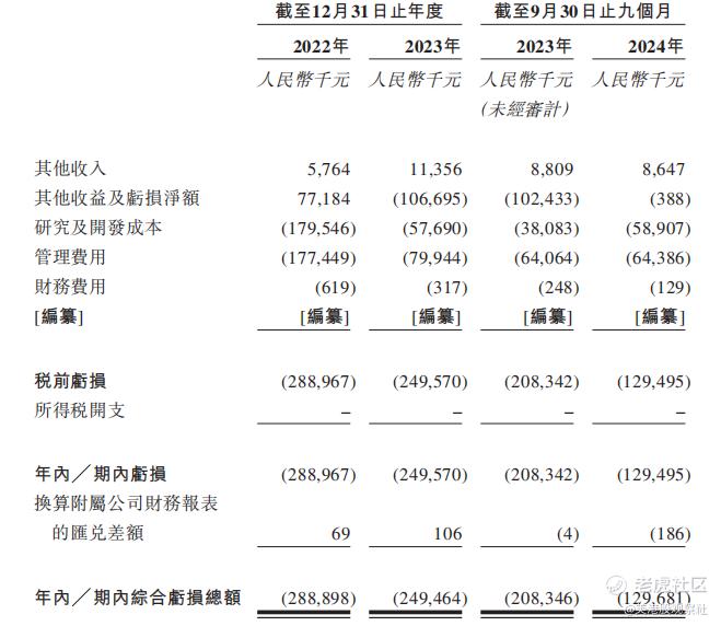 在过往记录期间,维升药业尚未从产品销售中获得收入,主要处于研发投入阶段,因此综合亏损总额较大。2022 年、2023 年及截至 2024 年 9 月 30 日止九个月,公司的综合亏损总额分别为人民币 288.9 百万元、人民币 249.5 百万元及人民币 129.7 百万元。亏损的主要原因是在研发方面的大量投入,包括对隆培促生长素、那韦培肽和帕罗培特立帕肽等药物的研发开支,以及管理费用和其他相关费用。在 2023 年,与取消采购先前储备药物原液的承诺有关的终止采购合同也导致了一笔较大的亏损(109.0 百万元)。公司预计在未来几年仍将持续投入大量资金用于临床研发、监管审批和商业化准备等活动,短期内难以实现盈利,亏损状态可能会继续维持,但随着产品的逐步商业化,有望逐渐改善财务状况。