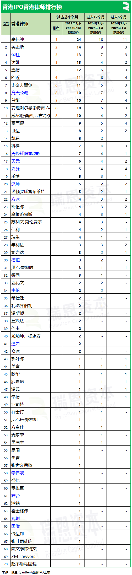 香港上市中介机构“香港律师”排行:高伟绅、美迈斯、金杜、达维,位列前三 (过去两年:2023年2月至2025年1月)