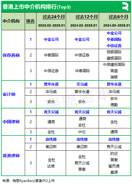 香港上市中介机构“保荐人”排行:中金、华泰、中信,位列前三 (过去两年:2023年2月至2025年1月)