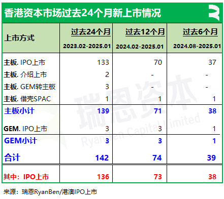 在过去的24个月(2023年2月至2025年1月)香港新上市公司 142家,主板上市139家(包括:133家IPO上市、2家介绍上市、1家借壳SPAC、3家GEM转主板),GEM(创业板)上市 3家;