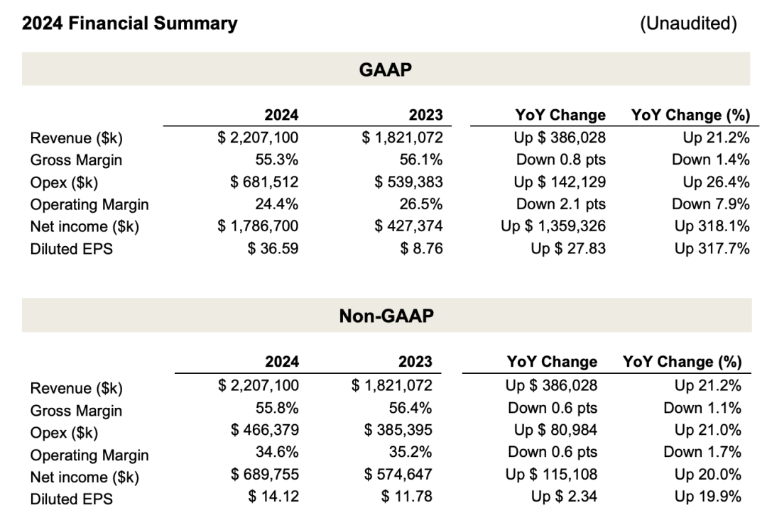 ● 全年营收达22.071亿美元,较2023年增长21.2%,这是MPS连续第13年的增长记录。