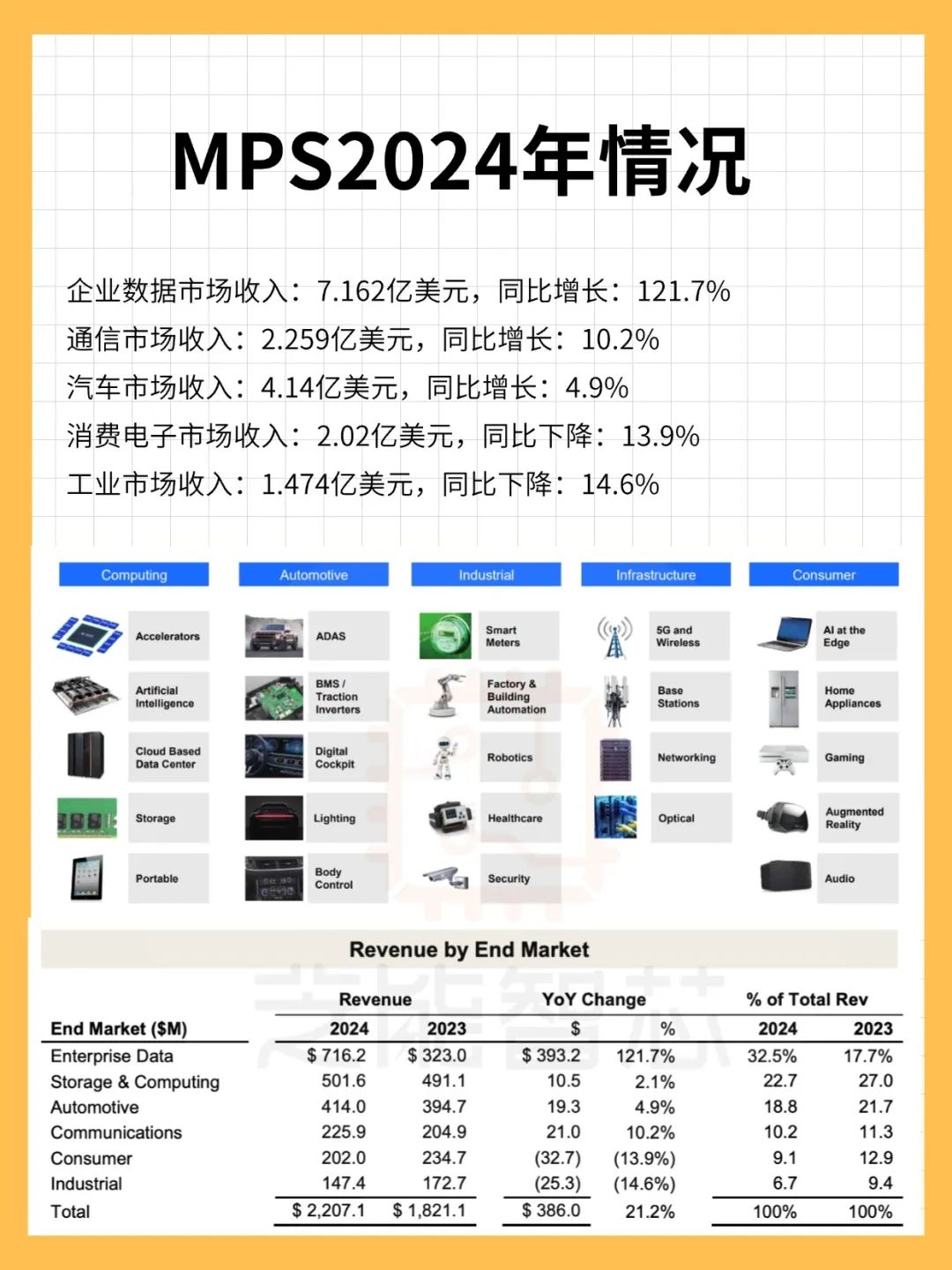 在企业数据、通信和汽车等关键市场的强劲表现,推动了收入增长。尤其在企业数据领域,MPS的电源管理解决方案在AI和服务器应用中的需求增长,成功占据了市场份额。