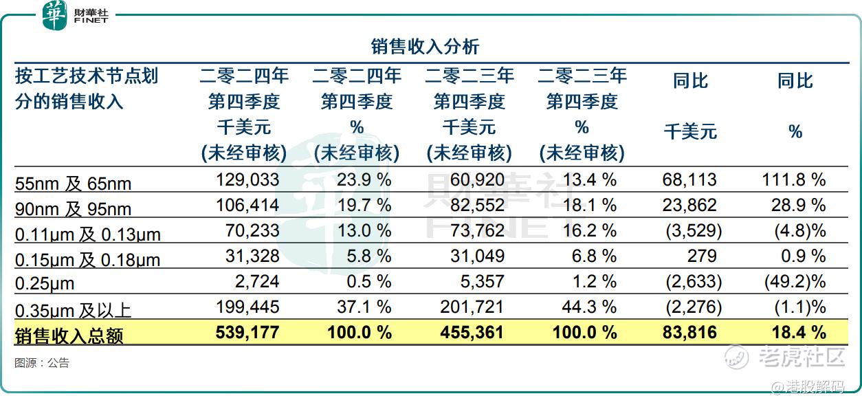 具体来看,数据显示,第四季度,华虹半导体的销售收入为5.39亿美元,同比增长18.4%,环比增长2.4%,主要得益于付运晶圆数量上升,但部分被平均销售价格下降所抵消。