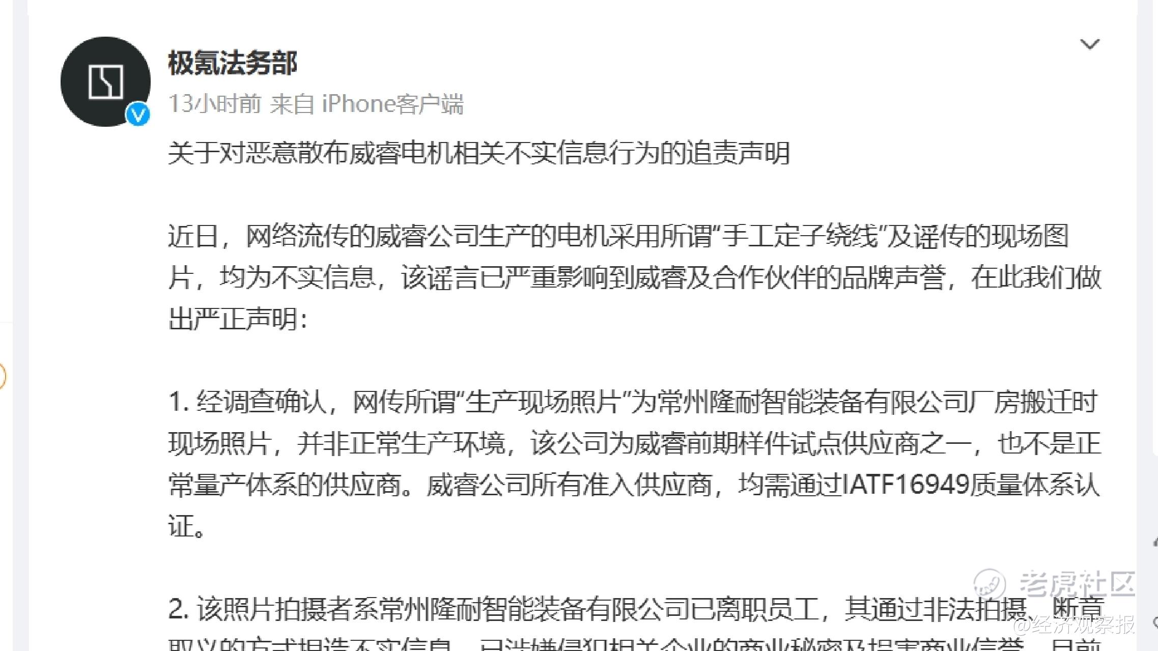 极氪法务部:网传威睿电机 “手工定子绕线” 为不实信息