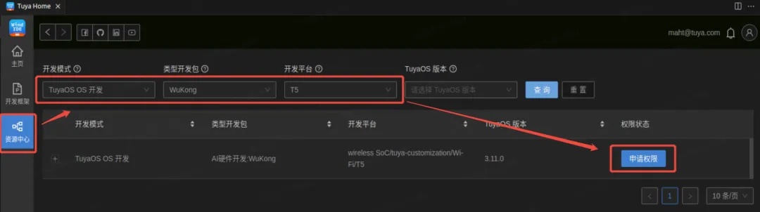 2、启动 Tuya Wind IDE,进入“资源中心”,按照下图选择,申请开发框架权限,填写涂鸦商务邮箱(界面会有邮箱地址提示),即可发起申请。