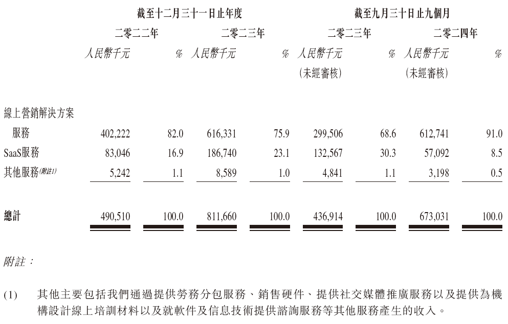 盘兴数智的收入主要来自在线营销解决方案服务、SaaS服务,及其他包括劳务分包服务、销售硬件、提供社交媒体推广服务以及提供为机构设计在线培训材料以及就软件及信息技术提供咨询服务等。