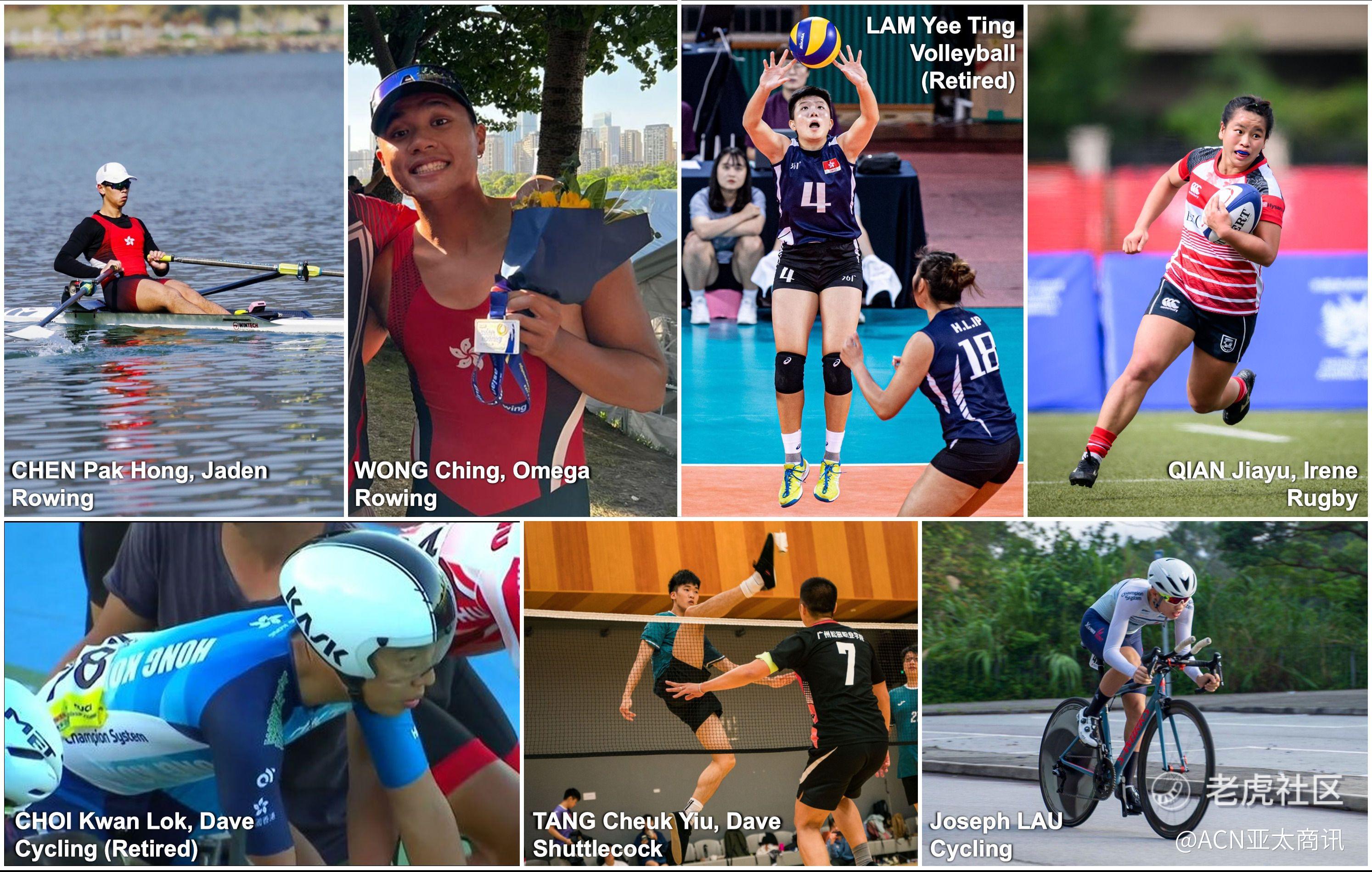2024/2025年度日清食品精英运动员奖学金得奖人在各自领域均表现出色。左上起:赛艇代表陈柏匡先生和黄钲先生、前香港排球队代表林绮亭小姐、榄球代表钱家裕小姐、前香港单车队代表蔡钧乐先生、香港足毽队代表邓卓尧先生及香港单车队代表刘睿哲先生。