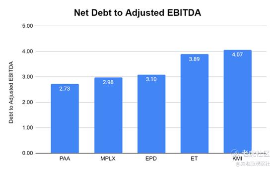 另一个盈利能力指标是DCF,因为这是分配和有机增长的支付来源。Energy Transfer的DCF估值倍数为8.31倍,在同行中排名第二低,而金德尔摩根为12.18倍。同行平均的DCF估值倍数为9.35倍,只有Plains All American的估值倍数低于Energy Transfer。