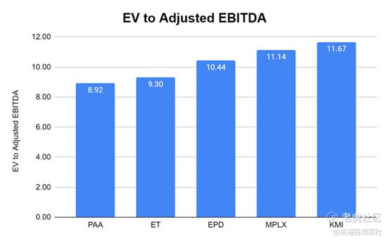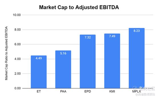 当查看Energy Transfer产生的调整后EBITDA时,其数字远远超过其他公司。Energy Transfer的调整后EBITDA达到154.8亿美元,而Enterprise Products以99.8亿美元位居第二。Energy Transfer的市值为695.1亿美元,其调整后EBITDA的估值倍数为4.49倍,低于同行平均的6.54倍。一个非常有趣的现象是金德尔摩根的估值倍数为7.49倍,而MPLX的调整后EBITDA估值倍数为8.23倍,但它们的调整后EBITDA都没有超过80亿美元。所以,Energy Transfer的估值非常低,即使从企业价值与调整后EBITDA的比较来看也是如此。许多人更倾向于查看企业价值,因为它考虑了Energy Transfer账面上的债务水平。Energy Transfer的企业价值与调整后EBITDA的估值倍数为9.3倍,这是同行中第二低的,低于同行平均的10.29倍。