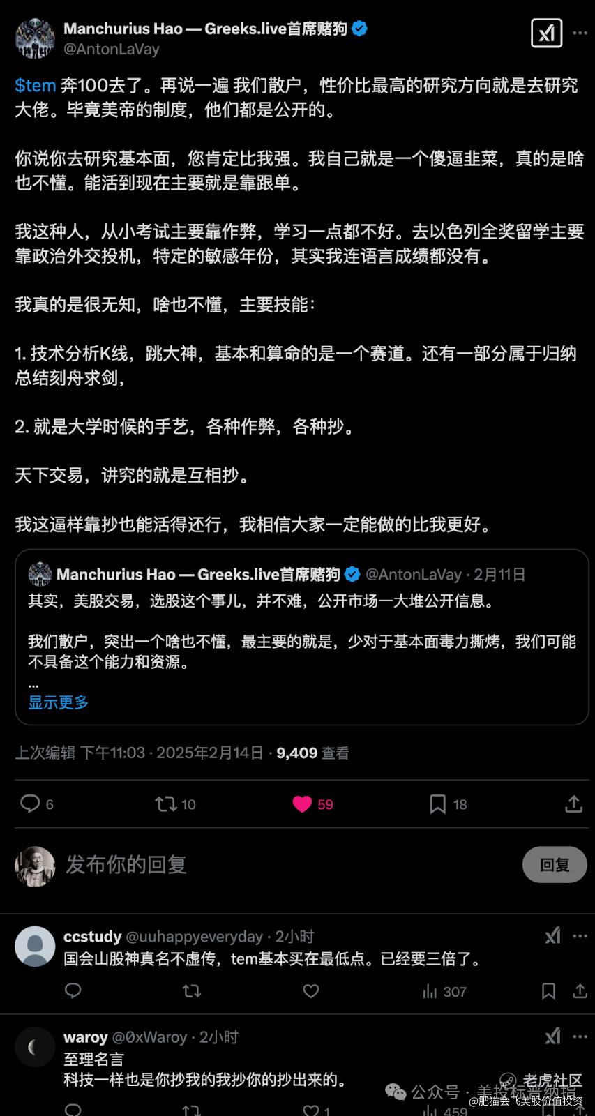 很多人喜欢举例说明大佬作业的成功,比如说「TEM因为国会山女股神买了,翻了三倍!」但这里面往往隐藏着一个逻辑漏洞——到底是因为大佬有眼光,还是因为大家相信大佬,于是纷纷跟单,最终推动股价上涨?