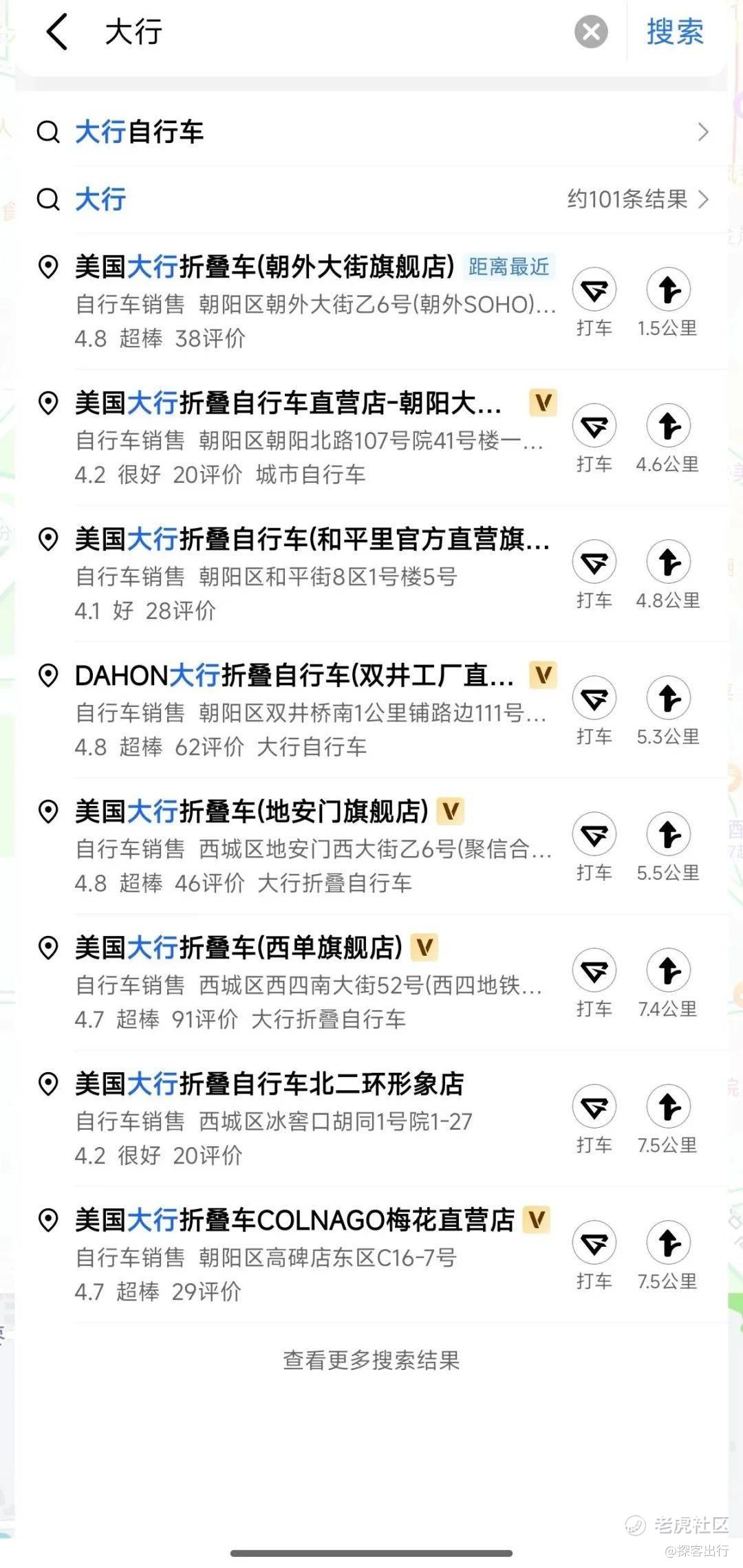 「探客出行」搜索发现,大行品牌的线下店铺名称在出行软件上均显示为“美国大行折叠自行车”字样,充分外显其“美国”属性。