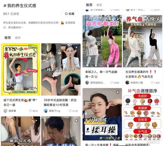 在小红书上,“我的养生仪式感”这个话题已经有85.1亿的浏览量,里面会有人分享,需要在晚上九点之前用艾草泡脚,然后刮肝筋、刮地筋、按压太冲穴和三阴交,并梳头皮100下。再往上加一些level的,还得按一下檀中穴,并且睡前在床上做“金刚趴”和“混元卧”。