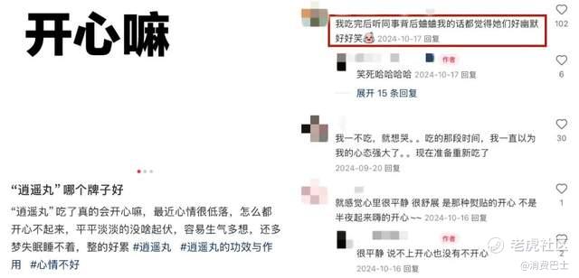 有网友提到服用逍遥丸后,“男朋友说我睡觉的时候都在笑”。在评论区,有人讲起自己因为工作特别焦虑,吃了逍遥丸后 “人的精神没那么累了”。还有 “病友”跟帖,说吃逍遥丸虽然没让她变开心,却让不用再像以前一样喝很多酒才能睡,一觉睡到天亮。