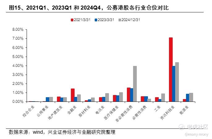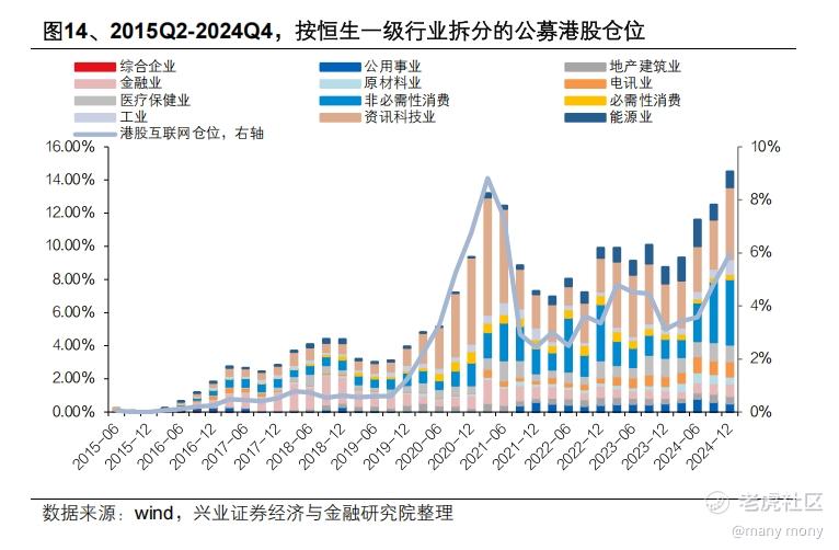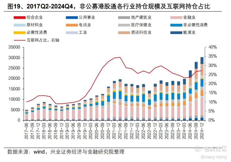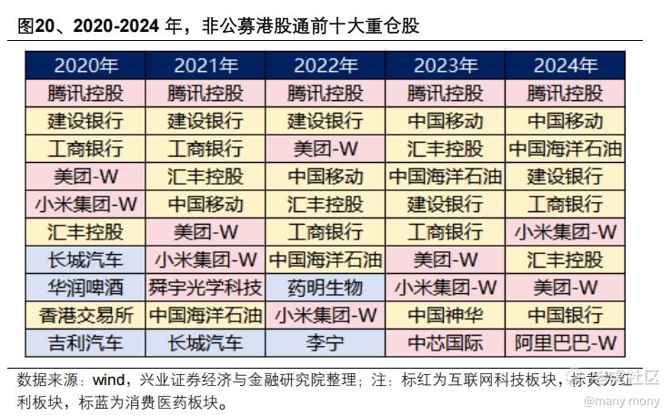 个股层面上,非公募港股通更偏好金融、能源和运营商等高股息标的。截至24Q4,剔除公募后的港股通资金前五大重仓股为 $腾讯控股(00700.HK)$ 、$中国移动(600941.SH)$、 $中国海洋石油(00883.HK)$ 、 $建设银行(00939.HK)$ 和 $工商银行(01398.HK)$ 。