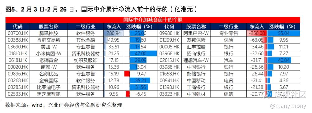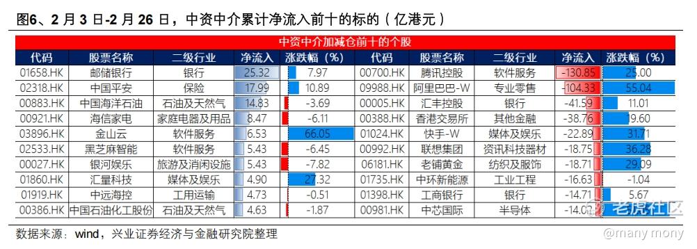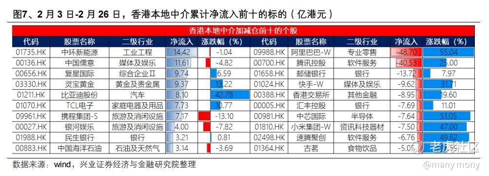 行业层面上,春节以来港股的火热行情中,AI和医药等成长板块是资金流入的主要方向,而红利相关板块遭减仓较多。根据测算,2月3日至2月26日,资金主要加仓软件服务、专业零售(主要为 $阿里巴巴-W(09988.HK)$ )、药品及生物科技、媒体及娱乐和电讯等板块,净流出银行、保险、建筑、纺织及服饰和工业工程等行业较多。