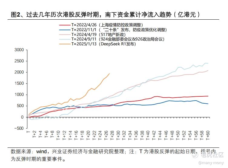 此外,相比于过去港股几次反弹,本轮南下资金流入更坚决。和22-24年期间4次由宏观因子驱动的反弹相比,由于本轮的改善更多源自产业趋势迭代和企业盈利修复,叠加港股仓位和估值在大涨后仍较低,因此本轮南下资金净流入节奏逐渐加速,尤其是在近一周震荡调整的市场环境中呈现出了“越跌越买”的特征。