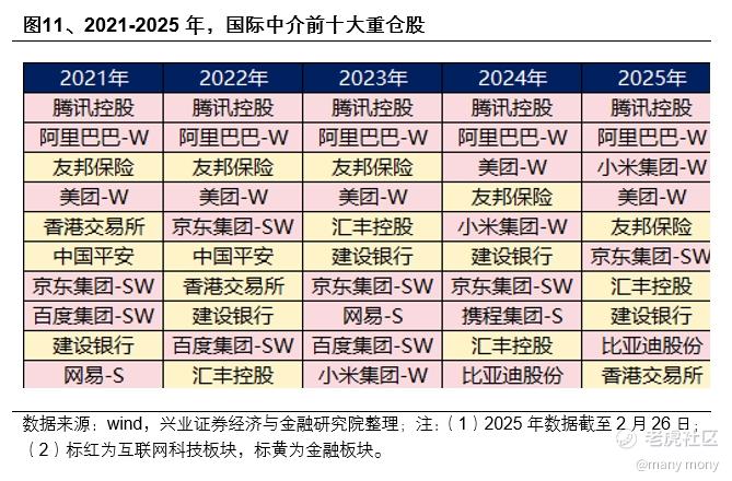 个股层面,2021年以来,外资前十大重仓股清一色为科技+金融龙头。截至2月26日,国际中介前5大重仓行业分别是 $腾讯控股(00700.HK)$ 、 $阿里巴巴-W(09988.HK)$ 、 $小米集团-W(01810.HK)$ 、 $美团-W(03690.HK)$ 和 $友邦保险(01299.HK)$ 。2021年以来,外资对个股的偏好也较为固定,前十大重仓股较为稳定,尤其是腾讯控股和阿里巴巴长期占据前两大重仓,当前多数重仓股的仓位已经高于21年2月和23年1月的水平。