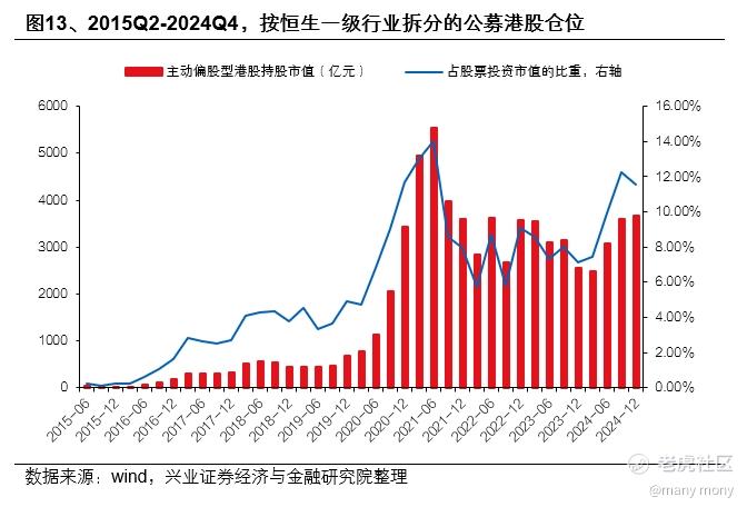 截至2024Q4,公募港股仓位为11.5%,较历史高点仍有一定提升空间。截至2024年四季度,全持仓口径下,主动偏股基金港股投资市值为3675.58亿元,占全部股票投资市值的比重为11.5%。假设其港股仓位回到历史最高水平的话,根据24Q4的持股规模推算,或仍有700亿以上规模的增量。