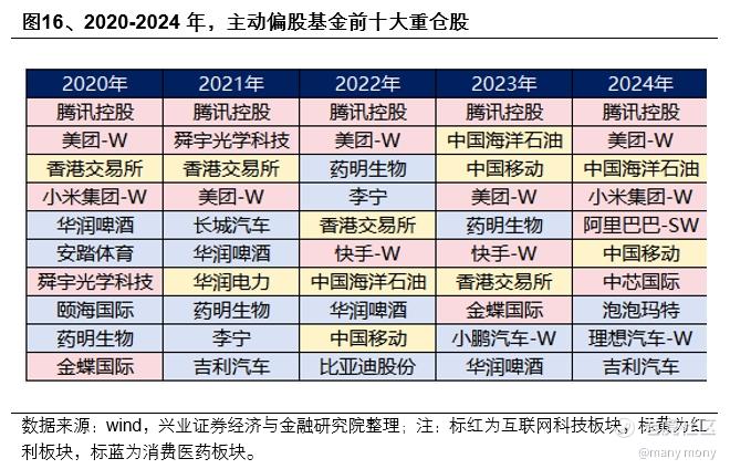 个股层面上,公募港股重仓股波动相对较大,但对于腾讯和美团的偏好较稳定。截至24Q4,主动偏股基金前五大重仓股为 $腾讯控股(00700.HK)$ 、 $美团-W(03690.HK)$ 、 $中国海洋石油(00883.HK)$ 、 $小米集团-W(01810.HK)$ 和 $阿里巴巴-W(09988.HK)$ 。